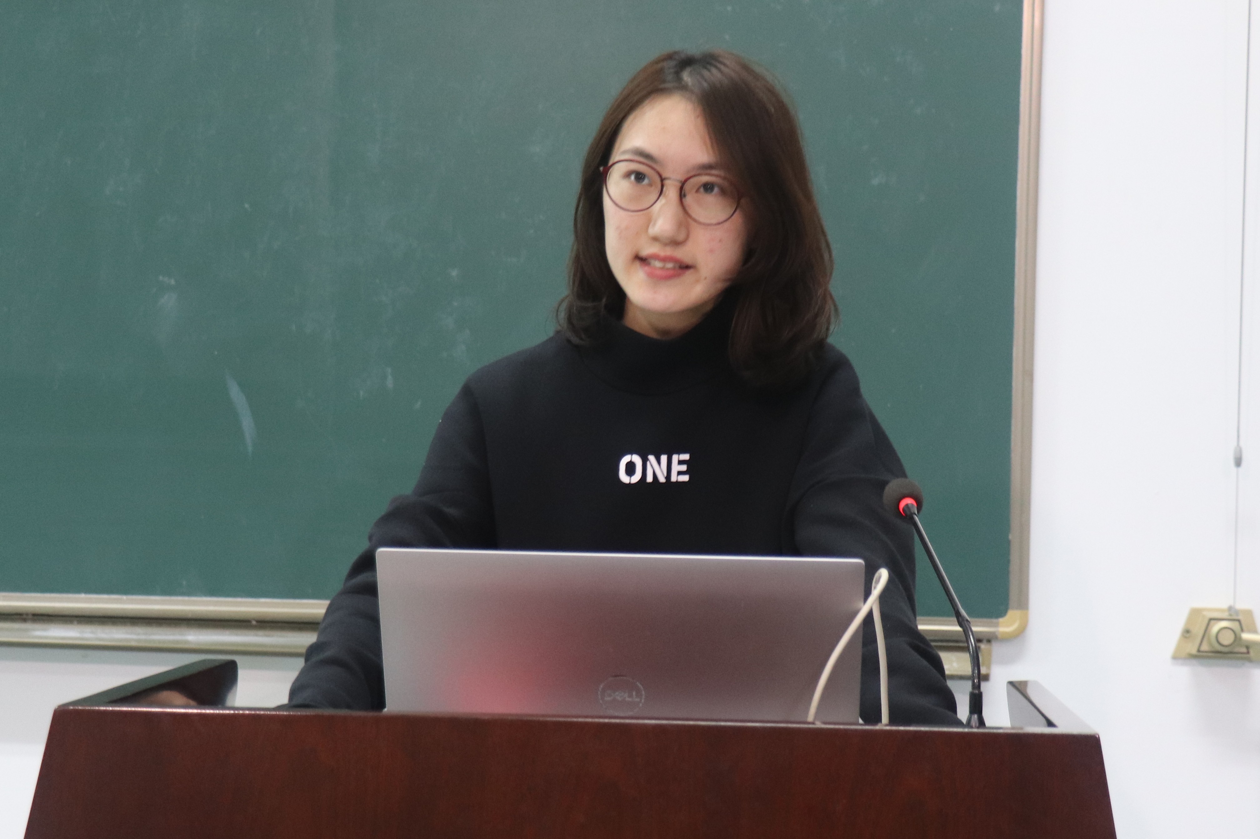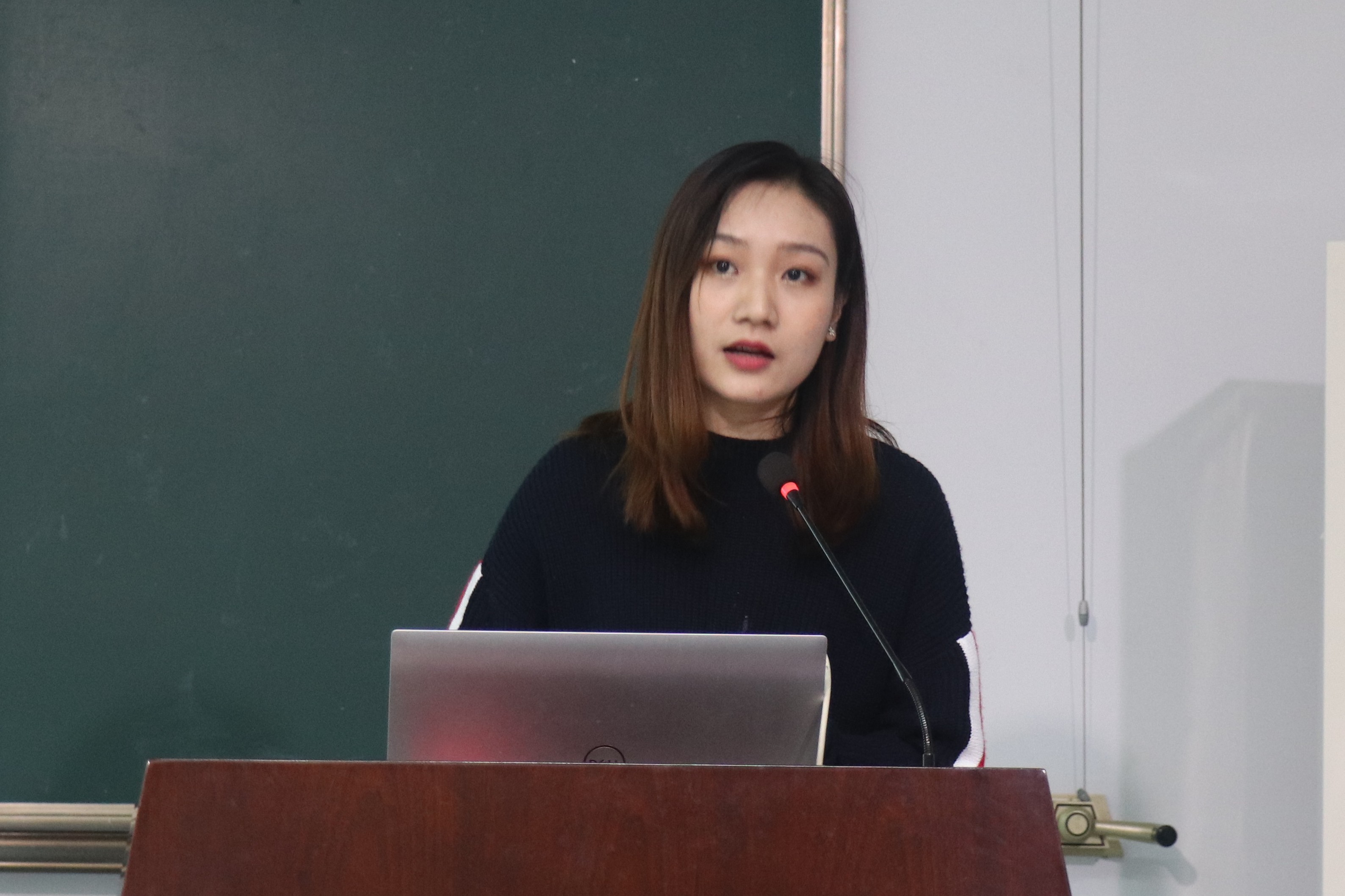 然后是学生代表付楚靖给同学们分享了自己的一些经验。她从创新性方面讲起,指出参赛项目常常出现无痛点或者痛点太泛的问题,提醒同学们注意。接着,付楚靖向大家提供了一些查询资料的网站和公众号,并提出应该让产品有亮点。最后她对产品策划书和行业市场两个方面进行了分析,也对本次参加明工的同学做出了鼓励。