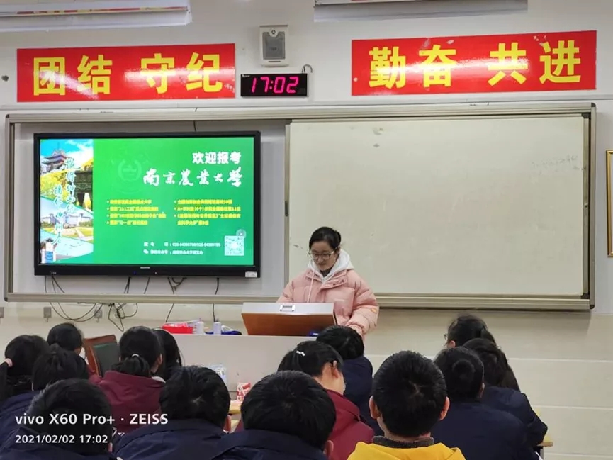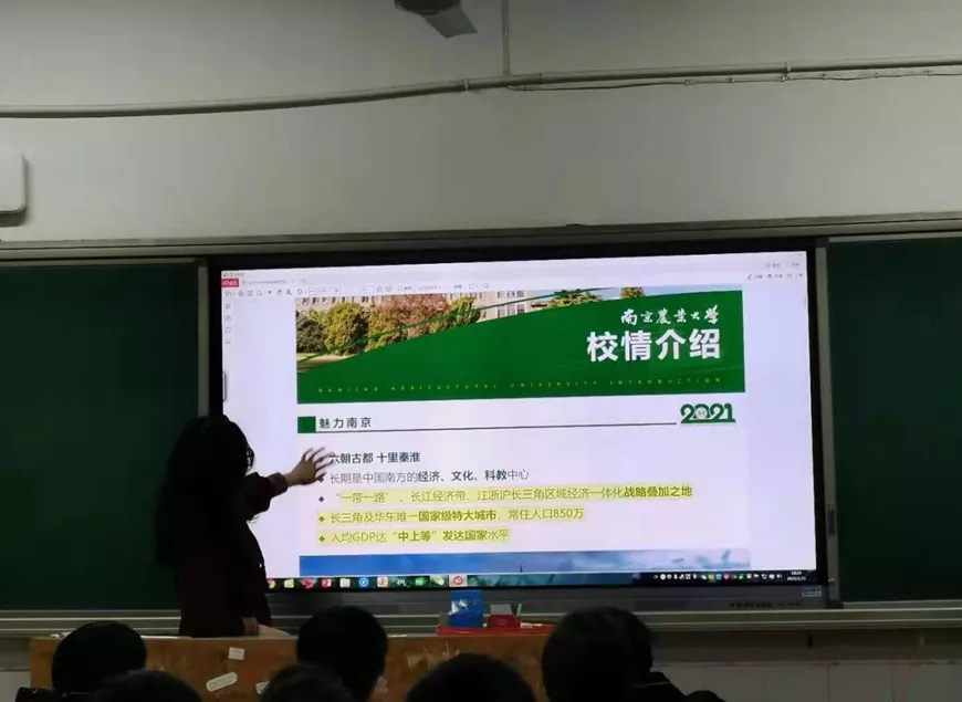 在此次宣讲中,我向学弟学妹们介绍了南农的优势学科、师资队伍、校园生活等,将宣讲PPT和学校的招生视频给同学们一一展示。