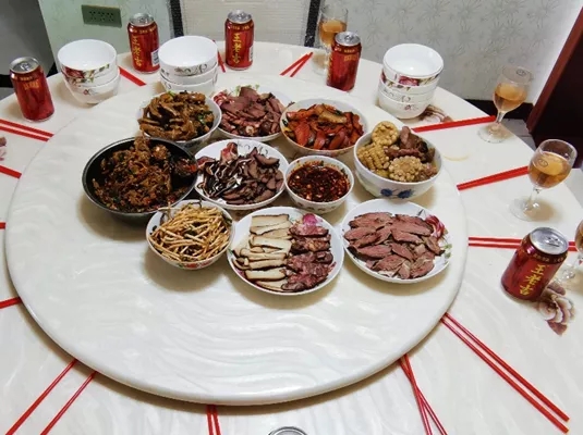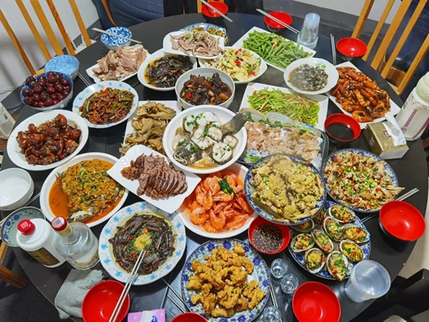 从内至外有清蒸鲶鱼,红烧鳝段墨鱼仔,象拔蚌刺身,蒜蓉蛏子,水煮大虾,酱牛肉,油炸小黄鱼,蒜蓉鲍鱼,红烧大虾,香辣牛蛙,香酥里脊,响油鳝丝,豆豉鸦片鱼头,红烧猪蹄,青椒牛柳,白切羊肉,豆干炒蒜薹,竹笋炒鱿鱼,炒豇豆,红烧茄子,凉拌猪肚,黄泥螺。因为靠海,所以在年夜饭饭桌上,会有许许多多的海鲜。