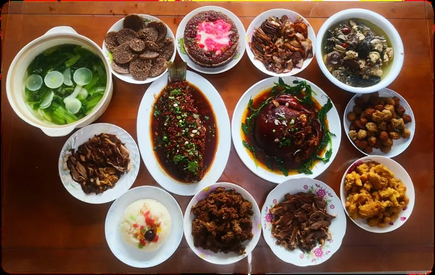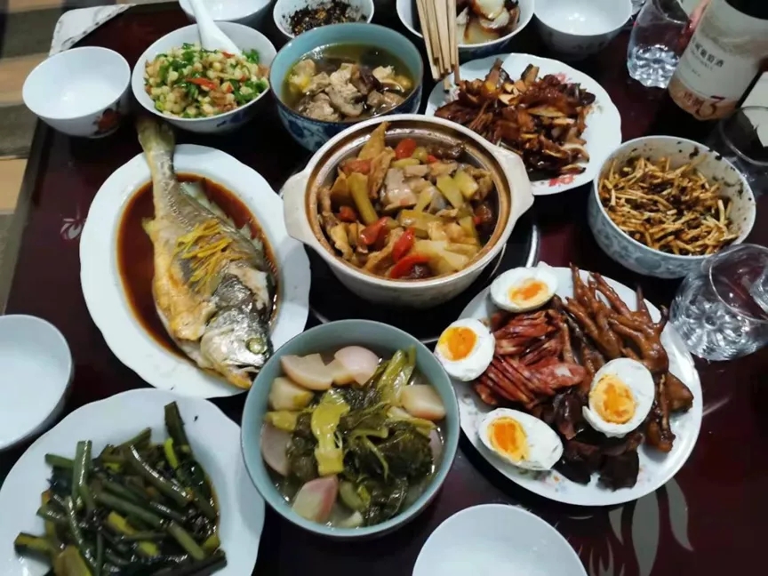 丰盛的年夜饭,荤素搭配,营养均衡,鸡鸭鱼肉,酒水管够。炖家养鸡,油焖大虾,凉拌野菜…