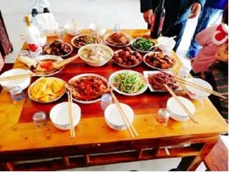 将所有的菜端上桌之后,需要摆好碗筷、斟满好酒,祭奠祖先之后才能动筷吃饭。腊肉、腊肠、辣子鸡以及酸菜鱼都是年夜饭必不可少的美食,重庆人喜辣,吃什么都离不开辣椒调味,也有很多家庭将火锅作为年夜饭的重头戏。在图上的年夜饭中,新鲜采摘的折耳根(鱼腥草),配合自制的蘸料,鲜嫩爽口,健脾开胃。玉米炖猪前爪,又意称“抓钱爪”,吃了的人在来年能够招财进宝、财源广进。新鲜肥美的鱼肉配合家庭自制泡菜,再撒上一把香菜,香气四溢,酸爽可口。胡萝卜炒腊肉,肥肉中的油脂将胡萝卜中脂溶性的β-胡萝卜素溶解,更利于人体消化吸收,也使得腊肉肥而不腻,更加美味。