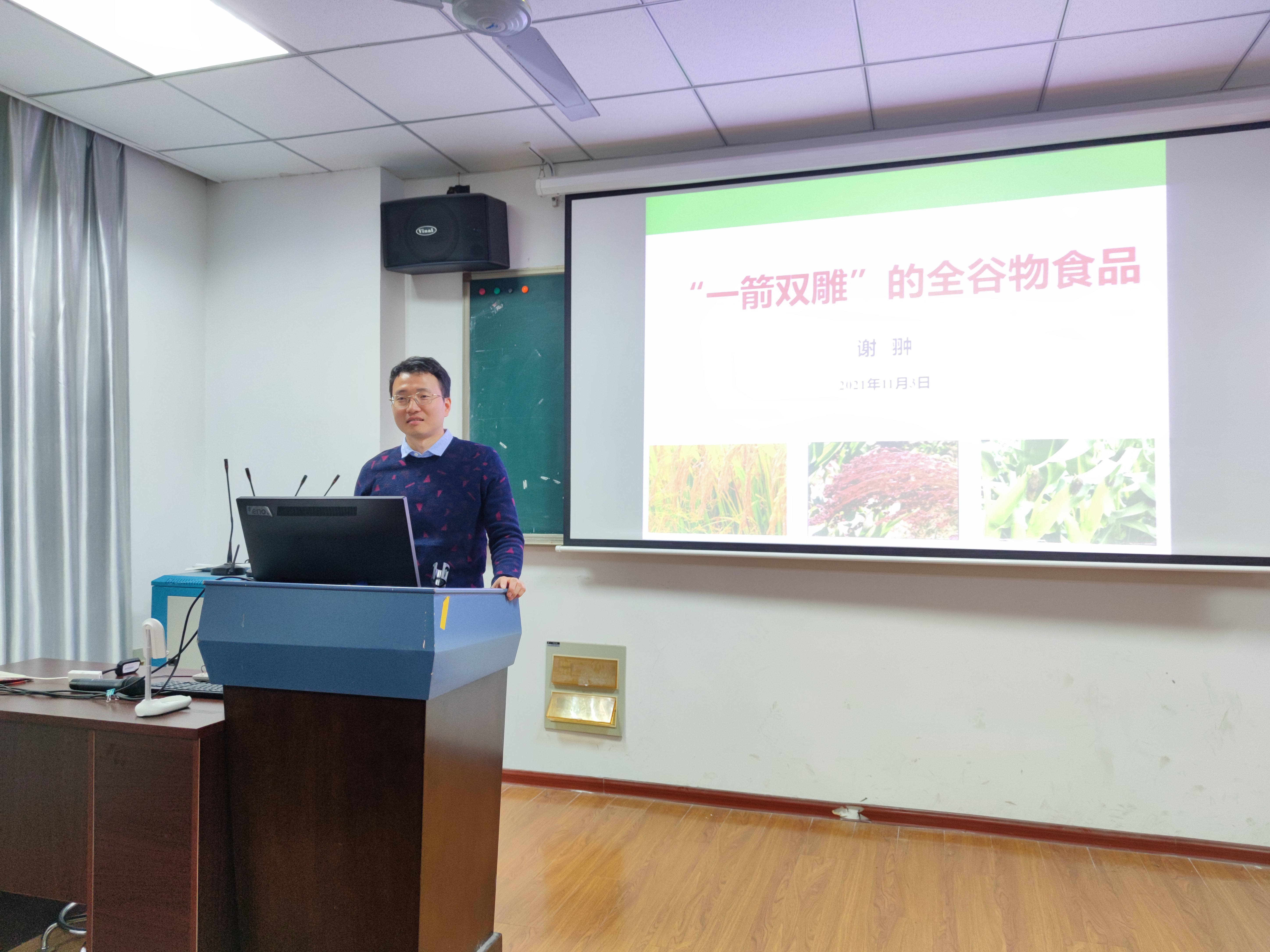 11月3日,谢翀老师以“‘一箭双雕’的全谷食品”为题向大家科普了全谷物食品的相关科学知识、发展状况及前景,并指出了目前全谷物行业亟待解决的粮食安全、产品结构、产业转型等一系列难题和解决方向,加深了同学们对本领域的了解认识。