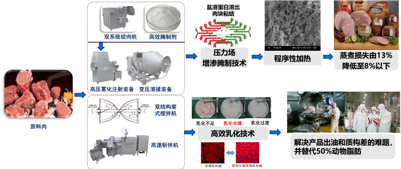 周光宏、徐幸莲教授团队针对低温肉制品加工机理与品质变化规律不明、质量控制技术缺乏及设备完全依赖进口等问题进行探索性研究,通过校企合作揭示了肌肉蛋白乳化、凝胶机制及主导色素变化规律,研发出高效乳化技术、压力场增渗腌制技术和高效复配腌制剂,优化了腌制、滚揉、斩拌和热加工关键工艺参数,创制出低温肉制品加工新工艺,有效解决了产品质构差和出水出油严重等技术难题;与企业联合研发了高效乳化斩拌机、双结构桨式肉糜搅拌机、盐水高压雾化注射、全自动变压真空滚揉设备及熏蒸煮多功能一体化装备,解决了我国低温肉制品加工装备完全依赖进口的局面,有力支撑了产业发展,成果在我国低温肉制品主要领军企业得到产业化应用。