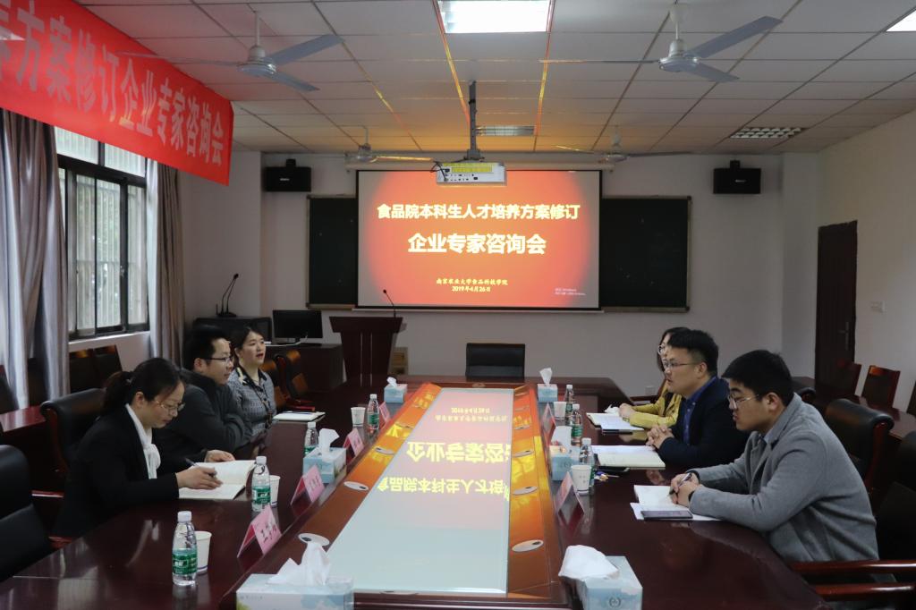 2019版本科专业人才培养方案修订工作研讨会—企业代表座谈会于院楼220会议室召开。江苏小厨娘餐饮有限公司人事经理潘银芳、山东凤祥股份有限公司人资管理中心招聘经理郭丽、南京健友生化制药有限公司研发经理胡铮、江苏省食品集团有限公司行政管理中心主管王梦瑶、电影天堂