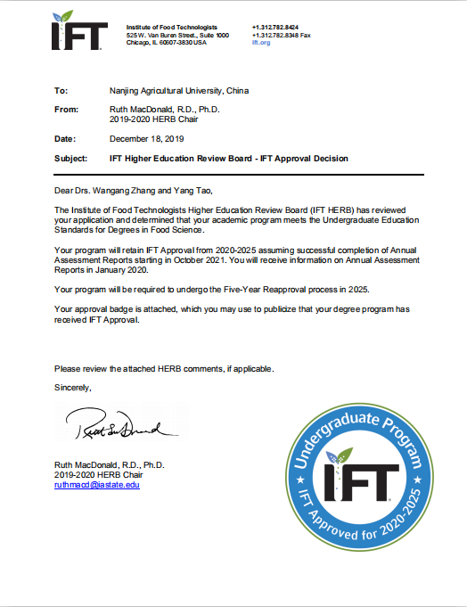 近日,经IFT (Institute of Food Technologists,美国食品科学技术学会)高等教育评审委员会全体成员认定,我校食品科学与工程本科专业历时2年,顺利通过IFT (Institute of Food Technologists,美国食品科学技术学会)食品专业国际认证评审,有效期5年(2020年-2025年)。至此,我校食品科学与工程专业也成为2018新版IFT认证标准执行后,国内首个通过IFT国际认证的专业。