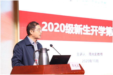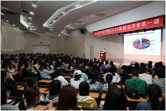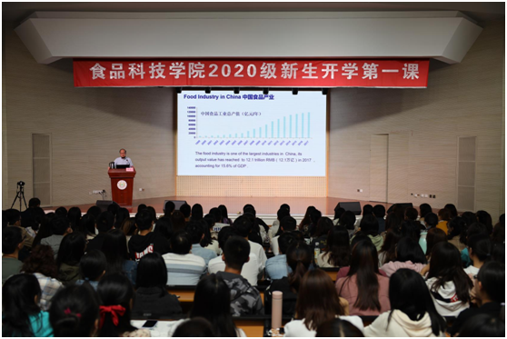 校长、中国畜产品加工研究会会长、国家肉品质量安全控制工程技术研究中心首席科学家周光宏教授主讲。食品科技学院党委书记孙健、副书记邵士昌、本研辅导员、全体2020级本科新生与研究新生近400人参加了本次报告。报告由孙健主持。