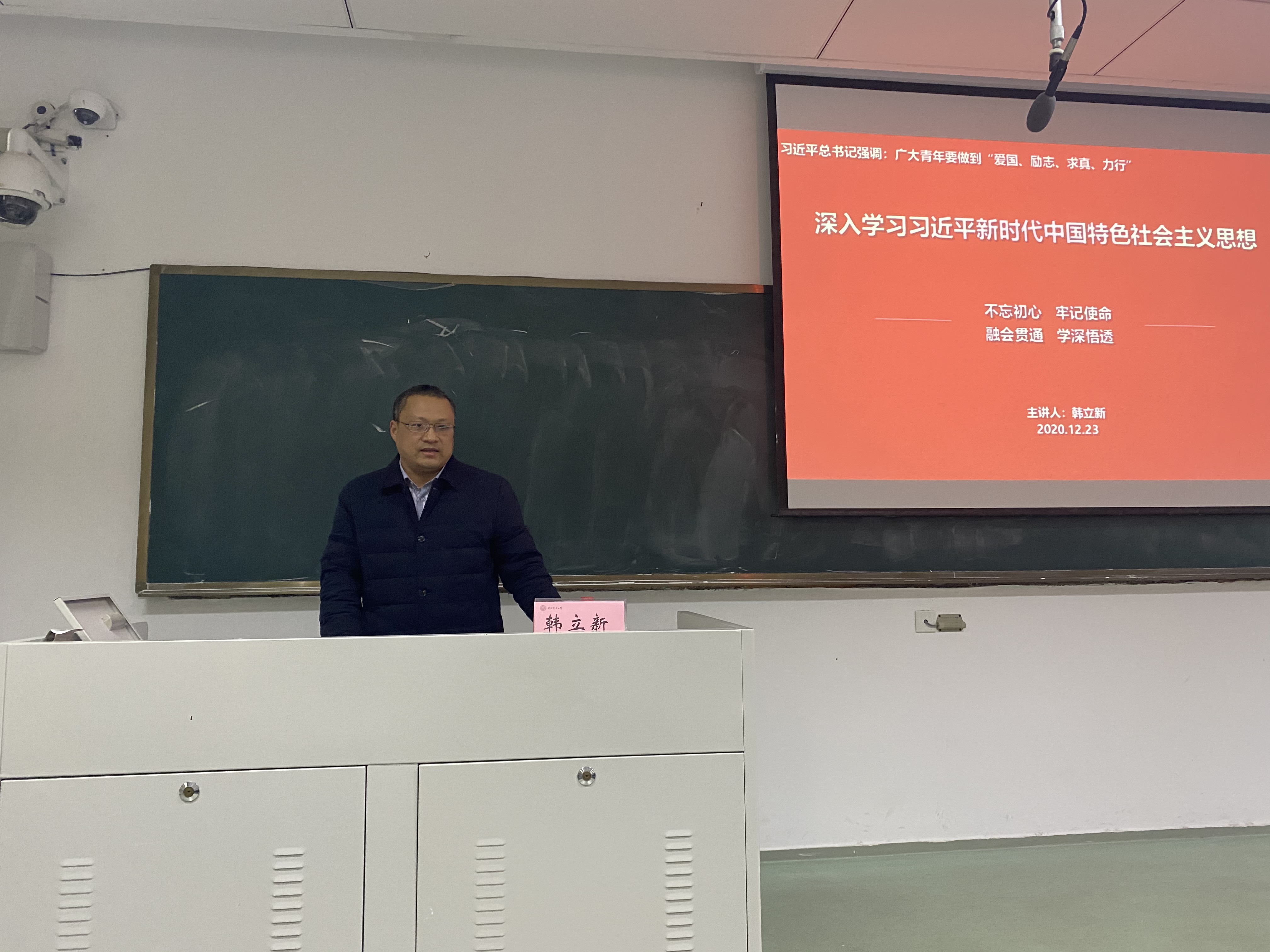 韩立新从掌握习近平新时代中国特色社会主义思想的主要内容和精神实质、正确认识当代大学生应该干什么以及如何做、如何与国家发展战略有机结合三个方面展开讲授。他介绍了习近平新时代中国特色社会主义思想产生的时代背景以及重要意义,以“八个明确和十四个坚持”为核心,对习近平新时代中国特色社会主义思想进行了全面系统的阐释。他希望全体同学能够加强理论学习,推动专业实践,拥有为人民谋幸福、为民族谋复兴、为世界谋大同的眼光和格局,结合专业特色,为推动社会主义现代化建设和实现两个一百年奋斗目标而不懈努力。