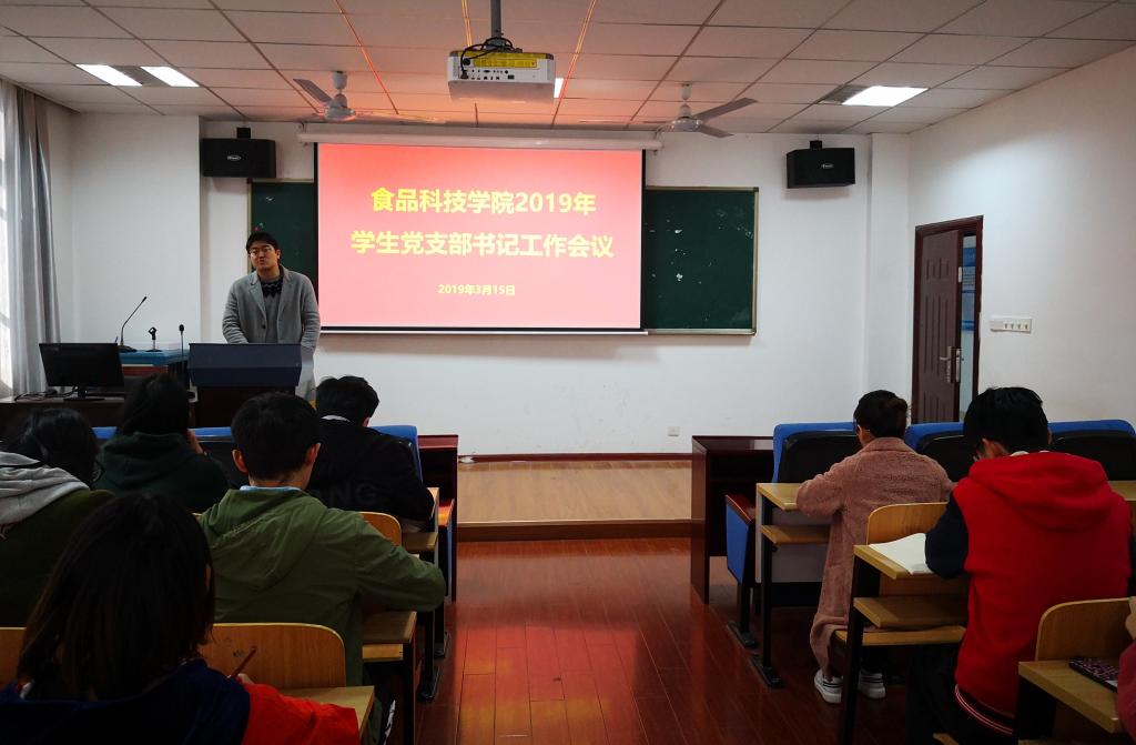 新学期学生党支部书记工作会议在食品楼215报告厅举行。食品院党务秘书陈宏强主持会议,对新学期学生党务重点工作进行了部署,随后各学生党支部对品牌活动(简称“一部一品”)进行了项目中期汇报。学院14个学生党支部书记参加会议。