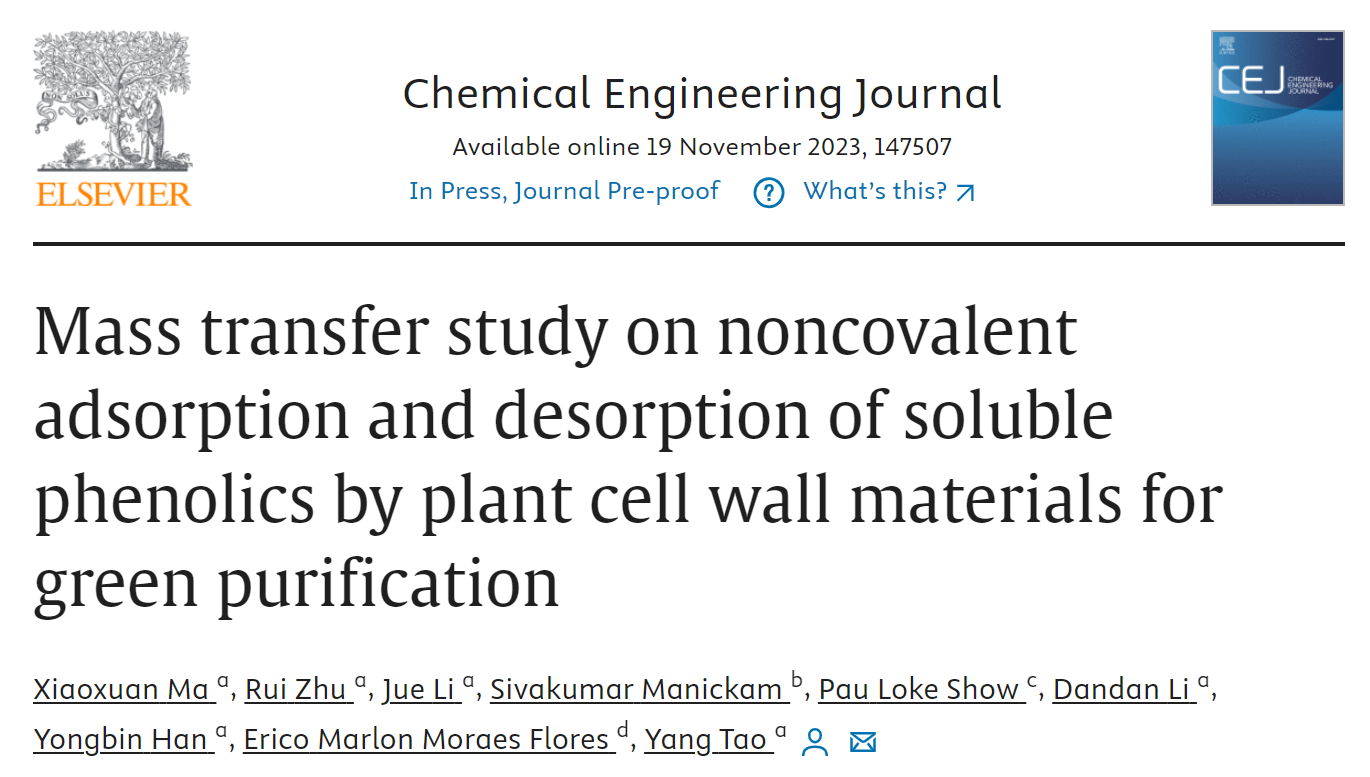 2023年11月,电影天堂 韩永斌、陶阳课题组在国际期刊Chemical Engineering Journal发表题为“Mass transfer study on noncovalent adsorption and desorption of soluble phenolics by plant cell wall materials for green purification”的研究性论文。揭示了植物细胞壁材料非共价吸附/解离可溶性多酚的物理传质新机制,开发了可溶性多酚绿色纯化新技术。