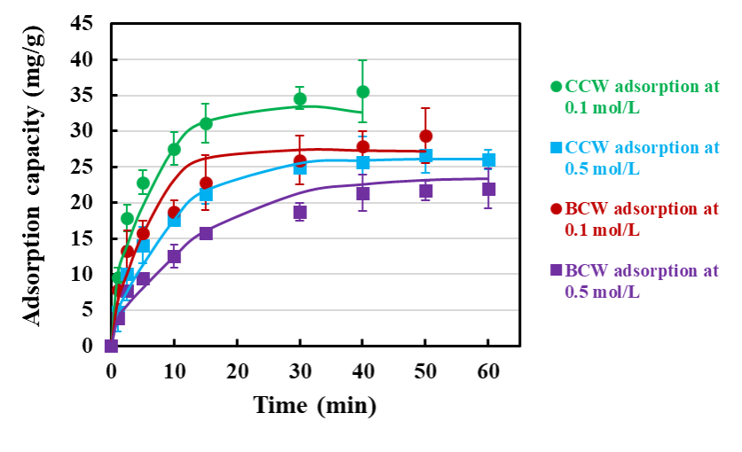 图1:不同环境离子强度下植物细胞壁材料对酚类物质的吸附动力学曲线